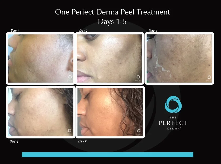 The Perfect Derma Peel is a more advanced treatment for clients familiar with chemical peels and ready for a results-oriented treatment with some downtime. This treatment can take 7-10 days for your skin to fully heal, with visible peeling likely for most clients. Most clients have visible peeling days 3-7, and in some cases through Days 9/10.